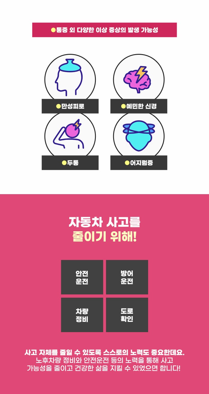 향후 후유증으로 이어질 수도 있기 때문입니다. 몸의 손상에 일상생활을 하며 생기는 신체적 정신적 피로가 더해진 상태에서 오랜 시간 후유증이 남을 가능성도 있다고 하는데요. 사고 이후 만성 통증으로 고생하거나, 그 밖의 여러 후유증으로 인해 알 수 없는 고통을 겪을 수도 있다고 합니다. 그렇기에 작은 사고라도 내 몸과 건강을 충분히 챙겼으면 합니다. 또한 사고를 줄이기 위한 노력도 꾸준히 필요합니다!