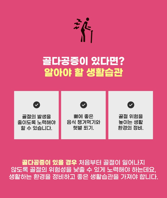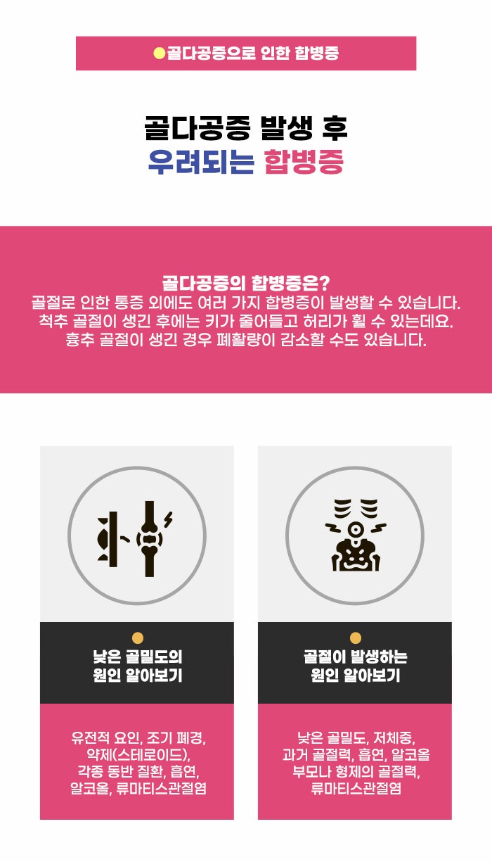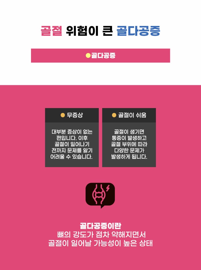 골다공증은 뼈가 약해지며 골절이 쉬운 상태가 되는 것이라고 합니다. 그렇기에 키가 줄어드는 것 같은 신체의 변화가 생기기도 하지만, 골절이 생기기 전까지는 골다공증 문제를 갖고 있다는 것을 잘 모를 수 있습니다. 골다공증으로 골절이 생길 경우 치유도 어렵고 또다시 골절이 생길 가능성도 큰데요, 골절이 생긴 부위에 따라서 심각한 통증과 후유증을 겪을 수도 있기에 골다공증의 위험성에 대해 아셨으면 합니다!